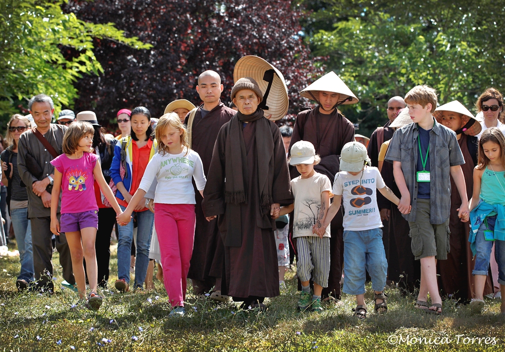 La meditación caminando nos permite abrir los ojos sobre todas las maravillas del universo, transformar nuestro mundo de aflicciones en la Tierra Pura, desprendernos de nuestros problemas y preocupaciones, tener paz y felicidad. Pero también nos muestra claramente todo el sufrimiento, los dolores y las penas de este mundo. Cuando estamos en estado de vigilia vemos el verdadero rostro de la vida. Yo solía decir a menudo a mis estudiantes: ¿Cómo queréis ver vuestro « verdadero rostro » si no sois capaces de ver lo que ocurre ante vuestros ojos y a vuestro alrededor ? No es cerrando los ojos como lo veréis. Al contrario, hay que tener los ojos muy abiertos, hay que permanecer despiertos ante la realidad de la vida, es decir, debemos ver nuestra verdadera naturaleza. El sendero perfumado a lo largo de los campos de trigo, los caminos bordeados de sauces, de frescos y umbríos avellanos, los parques y el sotobosque cubiertos de hojas amarillas y rojas… Esos son caminos a tu disposición para que practiques por ellos la meditación caminando. Valóralos. Esos caminos no te conducirán al olvido sino hacia el Despertar, para que veas la verdadera naturaleza del sufrimiento del mundo. En ese momento podrás practicar tu meditación sobre todos los caminos de la vida. Una vez despierto no dudarás más en tomar esos caminos. Sufrirás, por supuesto, pero ese sufrimiento no vendrá de tus preocupaciones personales, de tus problemas o temores. Al contrario, sufrirás por toda la humanidad y por todas las demás especies. Sufrirás porque las amarás con el amor de un Despierto, es decir, el amor de un bodhisattva. En chino, la palabra bodhisattva se traduce como aquél que está despierto. Por lo tanto, todos los que siguen tu mismo camino son también bodhisattvas.